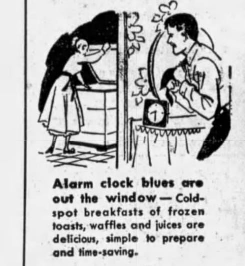 Frozen waffles were part of the same trend, helping busy families have a smoother morning, as Coldspot Freezers reminded consumers in this 1952 ad (which, again, predates Frank Dorsa’s “froffles” and indicates quite a bit of consumer awareness and market saturation):