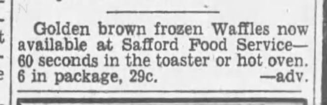 I was specifically looking for mentions of frozen waffles designed to be reheated in a toaster, which feels like a key part of the food’s journey to convenience food, no oven preheating necessary. Within these parameters, the earliest version of the product I could find was this ad from the Glen Falls, New York Post-Star in 1947: