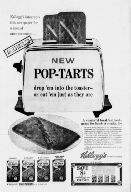Right around this time, some genius thought to take prepacked breakfasts to the next level and created toaster pastries. A company in Abilene, Texas seems to have been the first to advertise frozen pastries, in 1955, but that doesn’t necessarily mean they were intended for the toaster, which is what we’re looking for today. The key detail with the most familiar form of toaster pastries, come to think of it, is that they don’t need to be frozen.