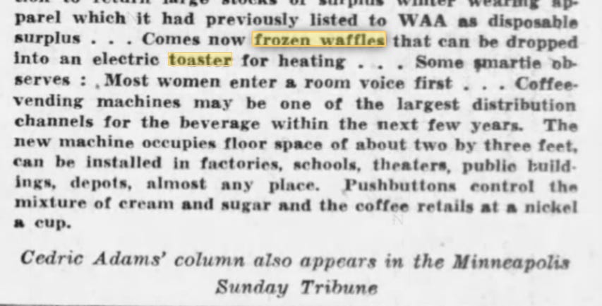 Toaster waffles also got a nod in the Minnepolis Star a few months later in 1947 (and here I’ve included some additional context that captures the cultural moment, including a misogynist joke and and a note about a new trend of coffee vending machines)